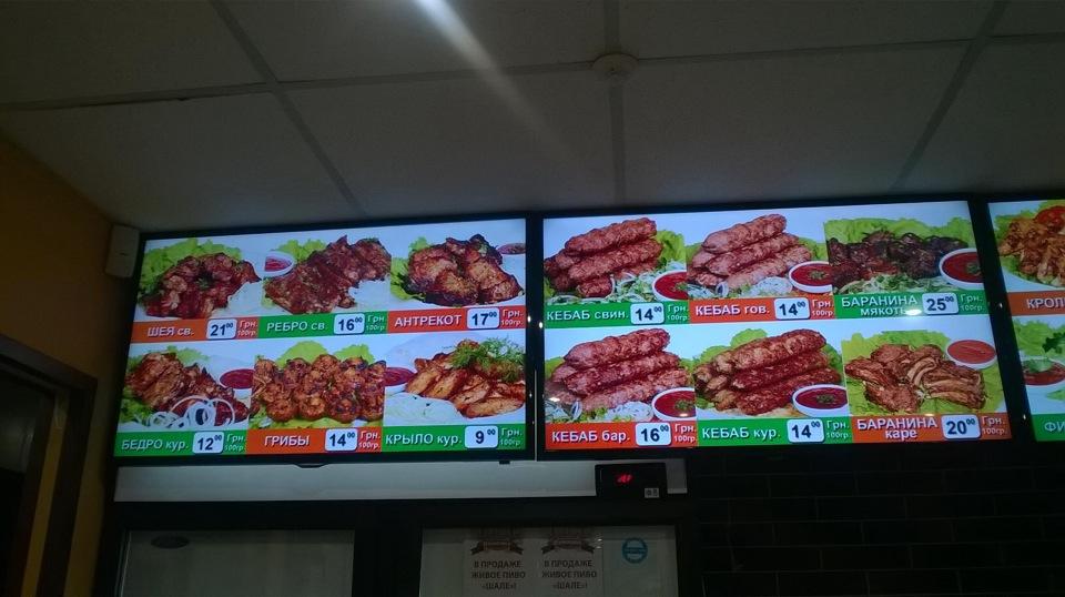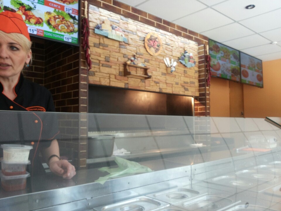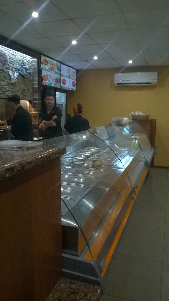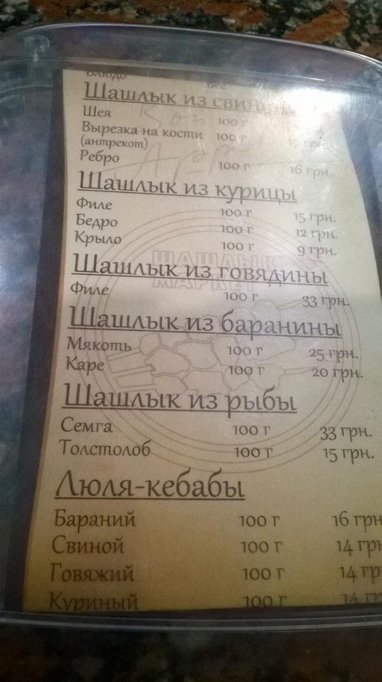 Вкусные грибы,свинина. Можно взять,что есть, можно чтоб при вас приготовили- без проблем за 15-20 минут.Есть терминал.Цена - в среднем 20грн./100 гр,но следите,чтоб лук вместе с мясом не взвешивали