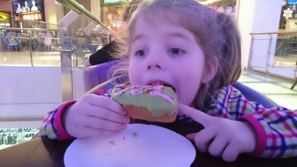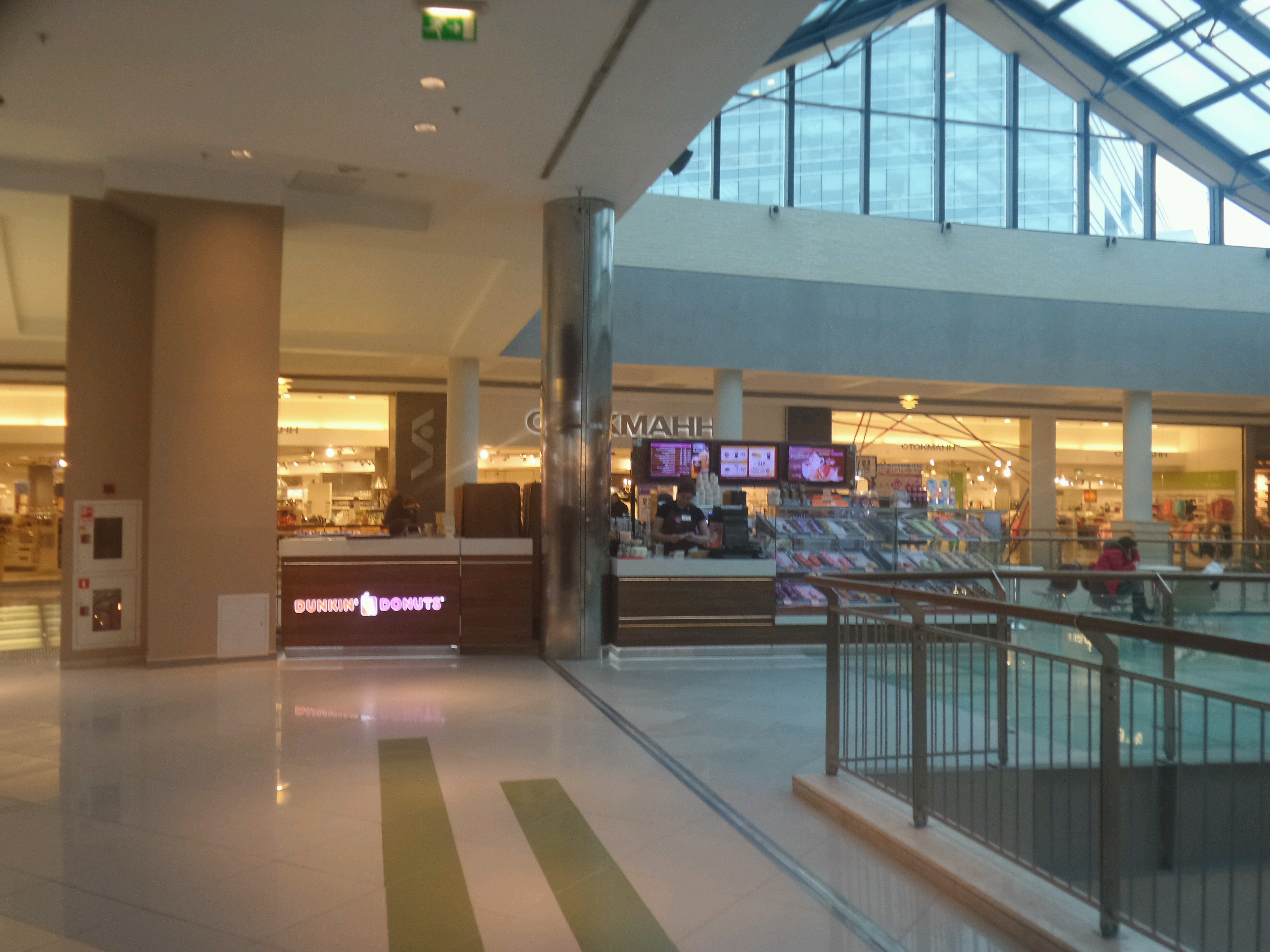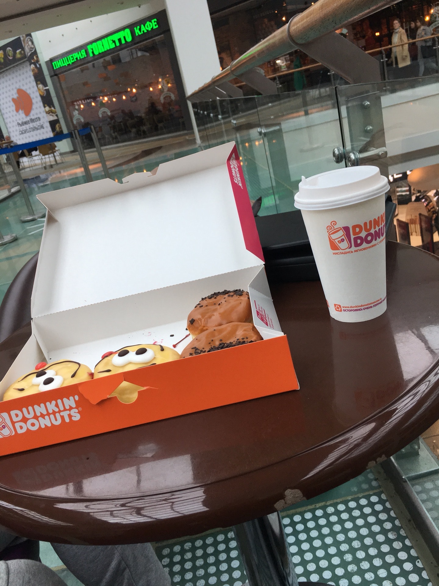 Неудобные кресла, сидишь между магазином и эскалатором. Пончики готовят не на месте, а привозят