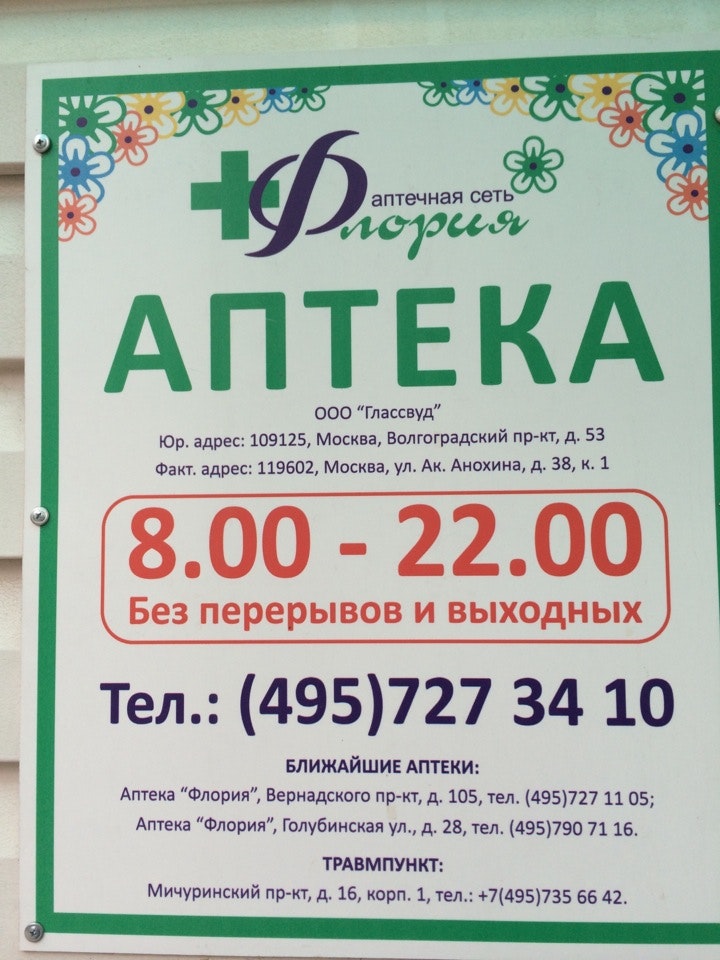 ⚕ Адрес, телефон, часы работы аптеки «Флория».