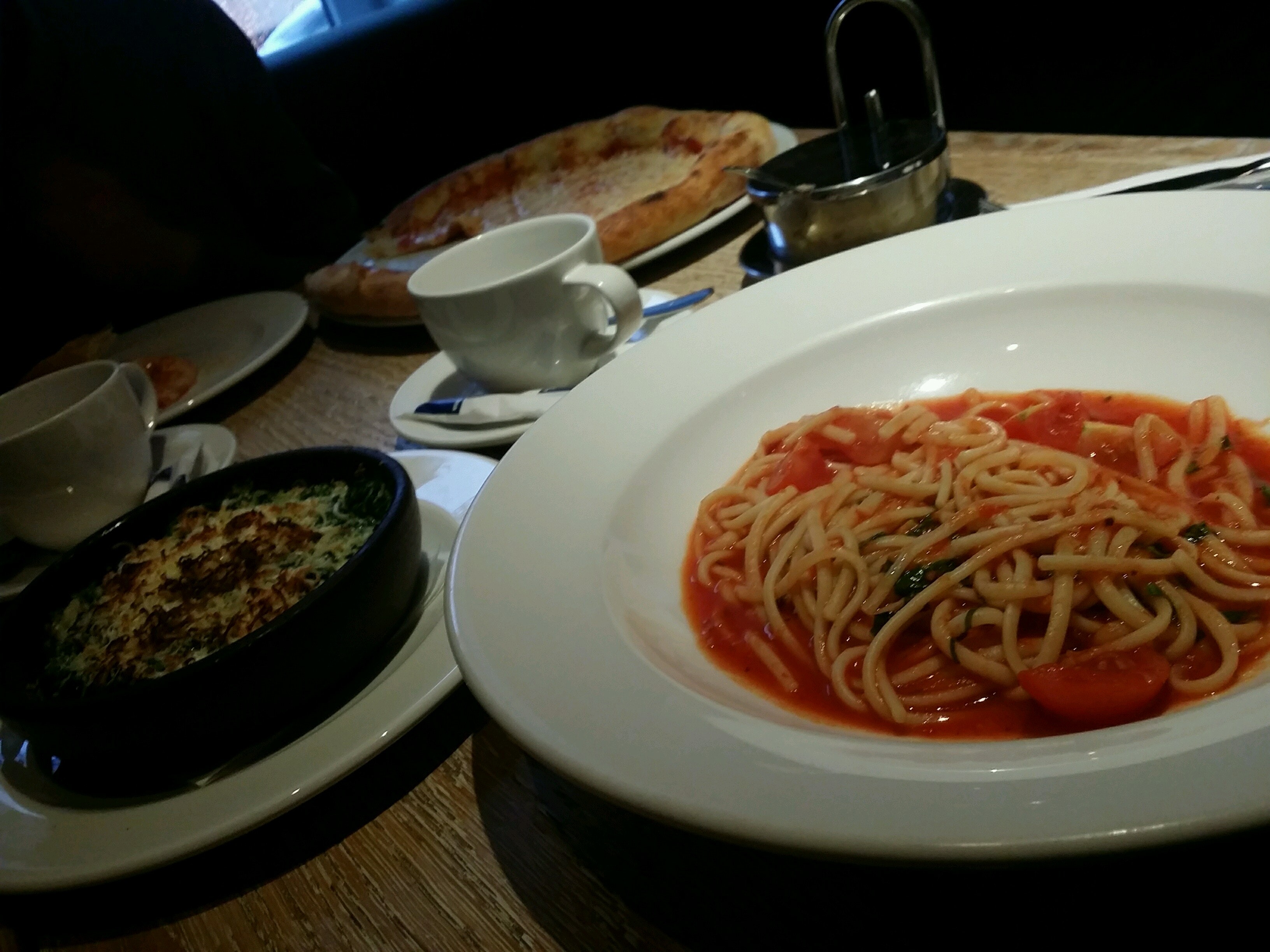 Даже в пятницу вечером тихо, спокойно, замечательный вежливый персонал. Паста "помидоры и базилик" довольно посредственная, но цена это оправдывает)