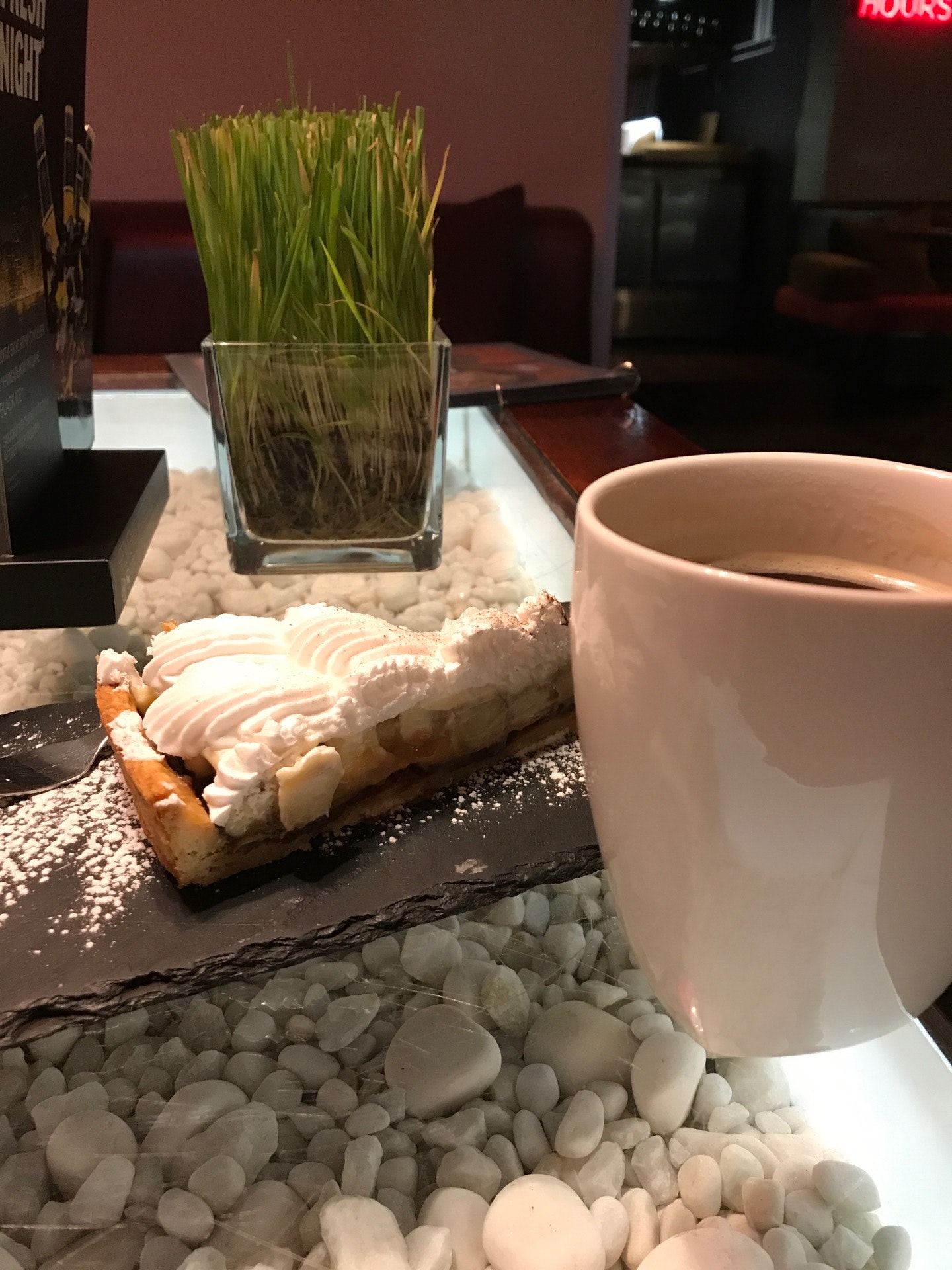Вечером в будни немного людей. Уютно, вкусно и хороший дизайн от помещения до меню.