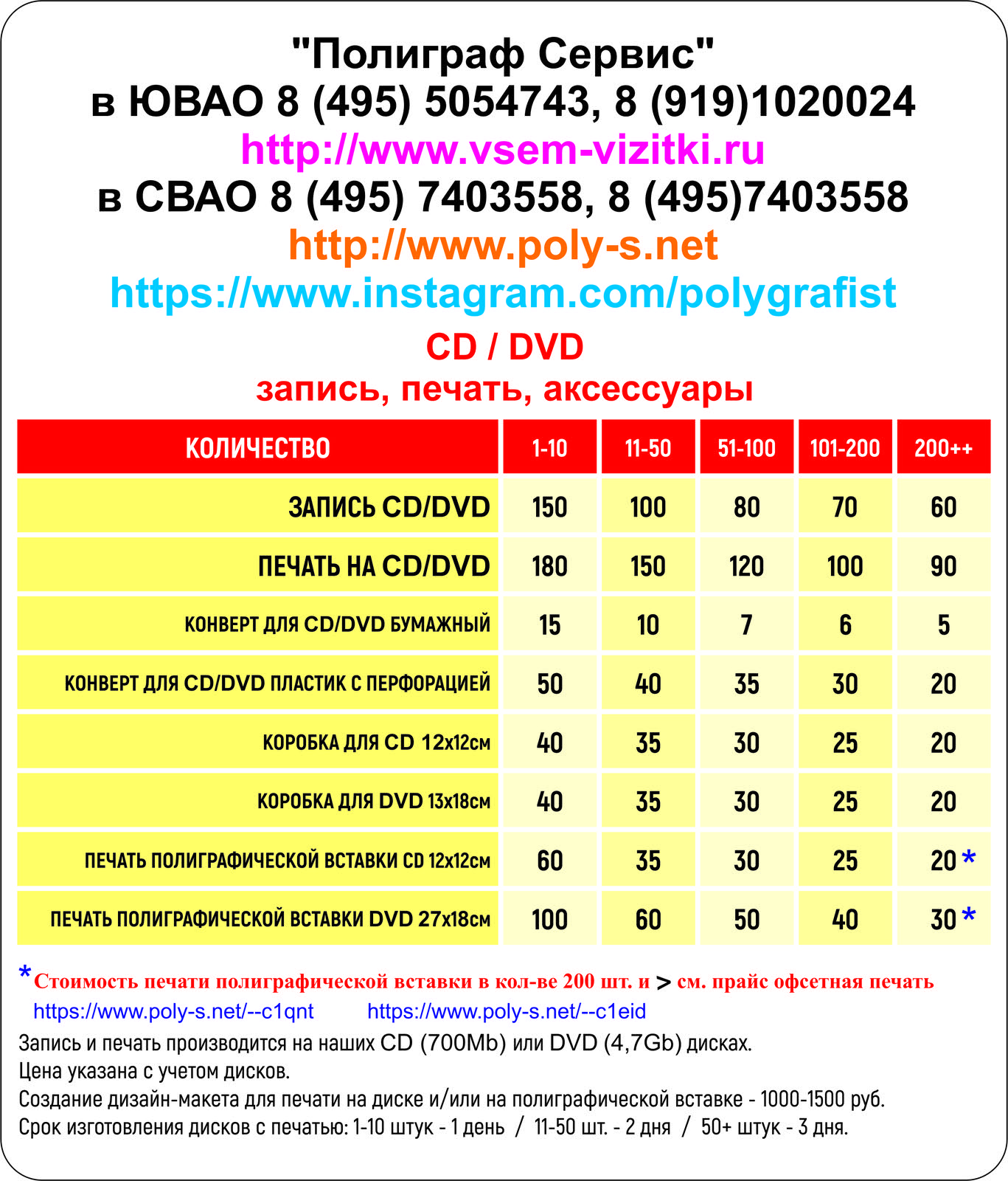 Москва http://www.vsem-vizitki.ru , ЮВАО, Рязанский проспект, 75с1 метро Рязанский проспект, 1-й вагон из центра, из метро направо 2-х этажное здание. Вход по центру здания со стороны Рязанского пр-та. На 2-м этаже направо по коридору до световой вывески Полиграфия. 8 (495) 5054743, 8 (919) 1020024 Москва http://www.poly-s.net , СВАО, 10 минут Бабушкинская, Медведково, ул. Сухонская, д. 7А, вход со двора магазина Магнит, 1-й этаж 8 (495) 7403558, 8 (495) 7402395 График работы Пн – пт. с 9.00 до 21.00, Сб (ОперативнаяТипография "Полиграф Сервис" ☎ в ЮВАО +7 (495) 505-47-43, +7 (919) 102-00-24 ☎ в СВАО +7 (495) 740-35-58, +7 (495) 740-23-95)