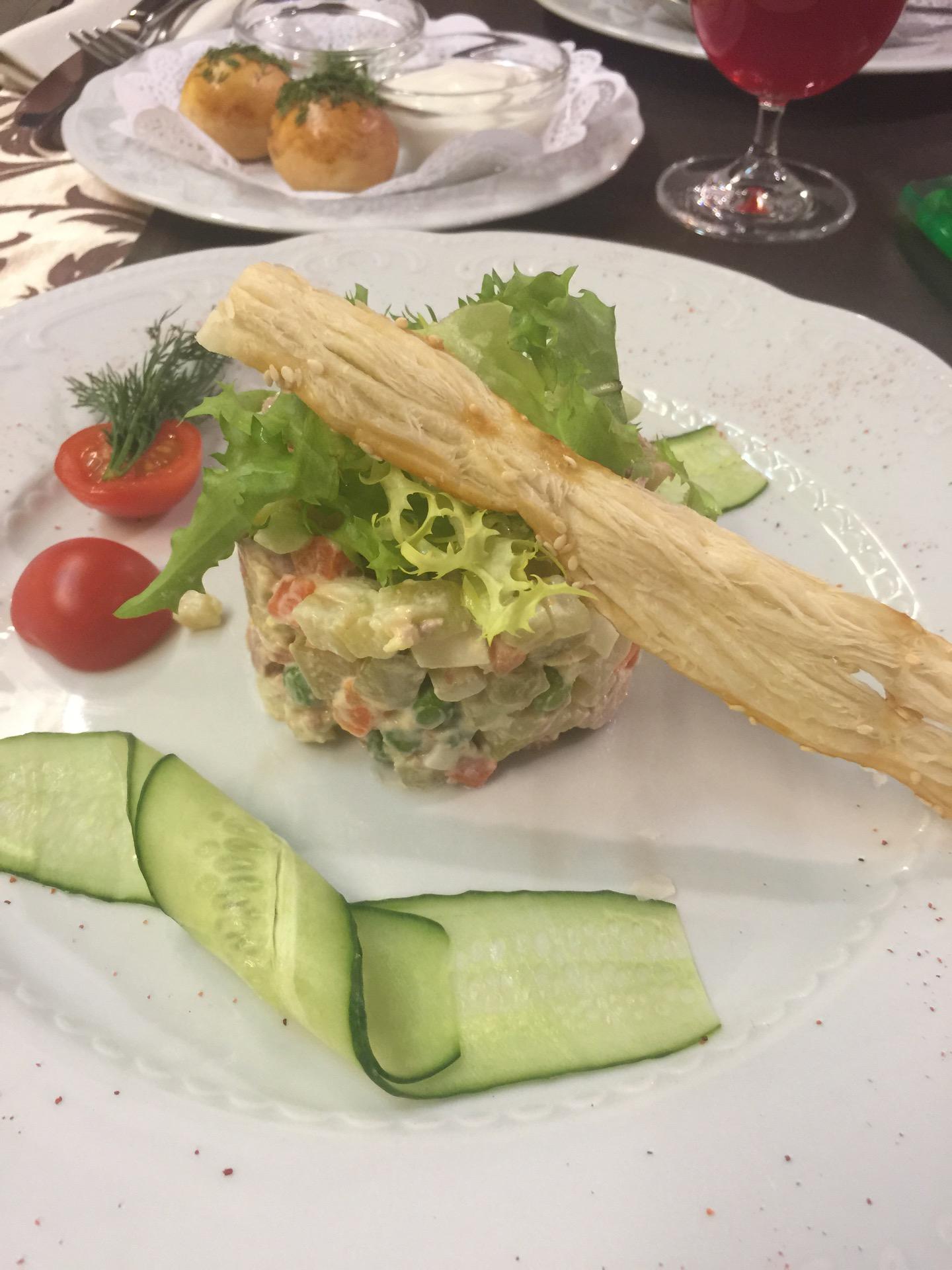 Уха из стерляди очень приличная! А вот селедочка под шубой не дотягивает, хотя внешне оформлена красиво. Морсы хорошие, но без ягод.