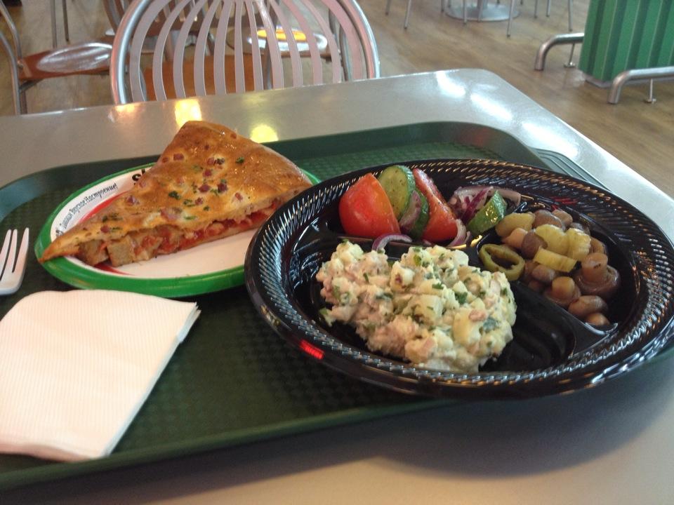 Греческий салат состоит из капусты!, помидоров, оливок и немного феты, огурцы отсутствуют.Странный греческий салат:-(Брать не советую