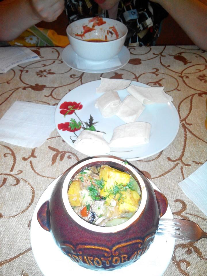 Уютно вкусно. Брали курицу в горшочке: в первый раз было мало курицы, во второй раз грибы вообще забыли положить. Чаевые уже включены в счет. Есть туалет, вайфай.