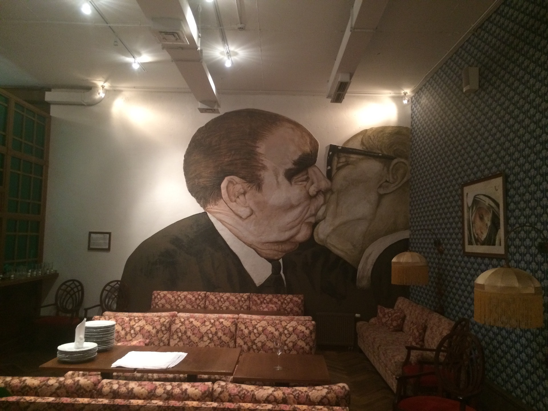 Очень интересный интерьер! Все в советском стиле. Еда соответствует эпохе)) медовик был очень вкусный)) из винной карты не все в наличии. Цены приемлемые